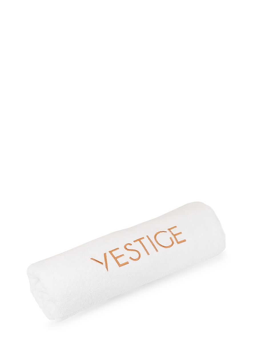 Asciugamano in spugna bianca logato Vestige, dimensione 90 x 200 cm.