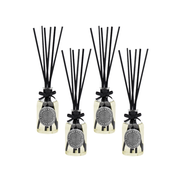 Confezione da 4 diffusori a osmosi in vetro trasparente e midollini in fibra sintetica nera, fragranza Oud & Miele, collezione Vanity Style, 100 ml