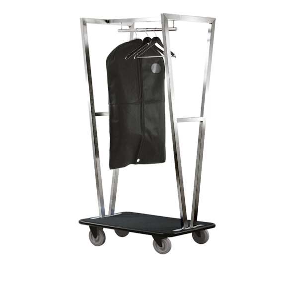 Gepäckwagen aus glänzendem Edelstahl, maximale Belastung: 300 kg, eingebauter Kleiderbügel, ausgestattet mit umlaufenden Gummipuffern, graue Räder Ø 20 cm mit Kugellager, zwei Bock- und zwei Lenkrollen mit Feststeller, Steel Line Kollektion, 100 x 60 x h 180 cm