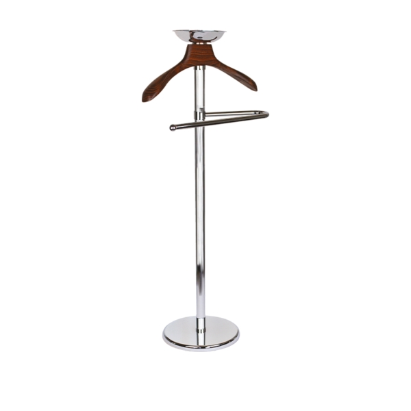 Stumme Diener aus verchromtem Messing mit Kleiderbügel aus dunklem Nussholz, Hsensteg und Objektträger, Ø 33 x 45 x h 118 cm, die zeitlose Eleganz des Klassischen, hochwertiges handgefertigtes Produkt, das sich durch elegante polierte Oberflächen und gestreifte Elemente auszeichnet, Made in Italy, Kollektion Classic