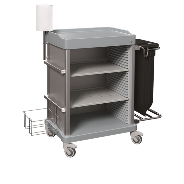 Klappbarer Wäschewagen ‚Alma‘ mit Putzzubehör, Struktur aus Aluminium und ABS, 138,1 x 57 x h 131 cm (offen) / 74,6 x 57 x h 131 cm (geschlossen), ein abschließbarer Einmerhalter (Eimer nicht im Lieferumfang inbegriffen), ein Rollenhalter und zwei Besenhalter (Rolle und Besen nicht inbegriffen), Top aus ABS, faltbarer Wäschesackhalter aus Stahl mit Deckel aus Polypropylen, inklusive 120-Liter-Wäschesack aus schwarzer Baumwolle, zwei Höhenverstellbare Ablageflächen, verschließbare Basis aus Stahl, vier Lenkrollen (Ø 12,5 cm), zwei mit Bremse, Made in Italy
