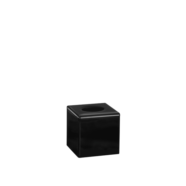 Würfelförmiger Kleenexhalter aus schwarz glänzendem ABS, freistehend, 12 x 12,5 x h 12,5 cm