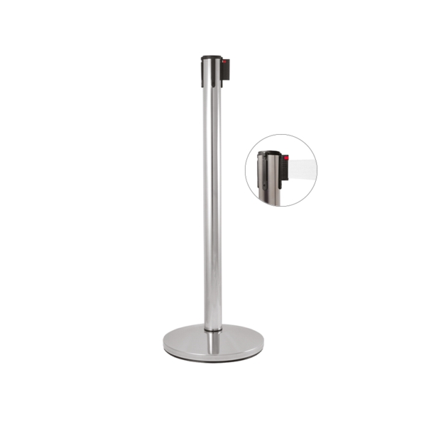 Barrier pole in polished steel and white strap, Ø 36 x h 101 cm, maximum strap length: 3 m, self-braking strap tensioning system, also suitable for outdoor use