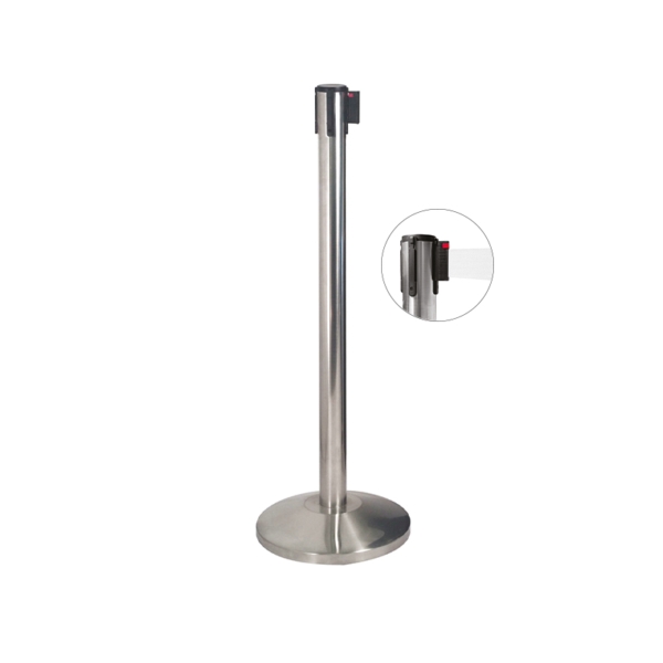 Barrier pole in satin steel and white strap, Ø 36 x h 101 cm, maximum strap length: 3 m, self-braking strap tensioning system, also suitable for outdoor use