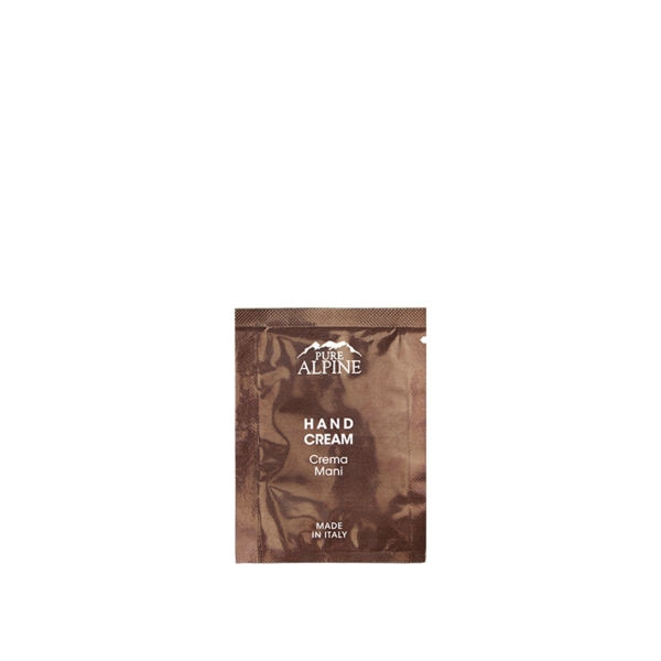 Pure Alpine Deluxe, Hand Cream, Ebony and Spices fragrance, 3 ml, dermatologically tested, 100% recyclable packaging, 6 x h 8 cm, Made in Italy, 500 pcs per box