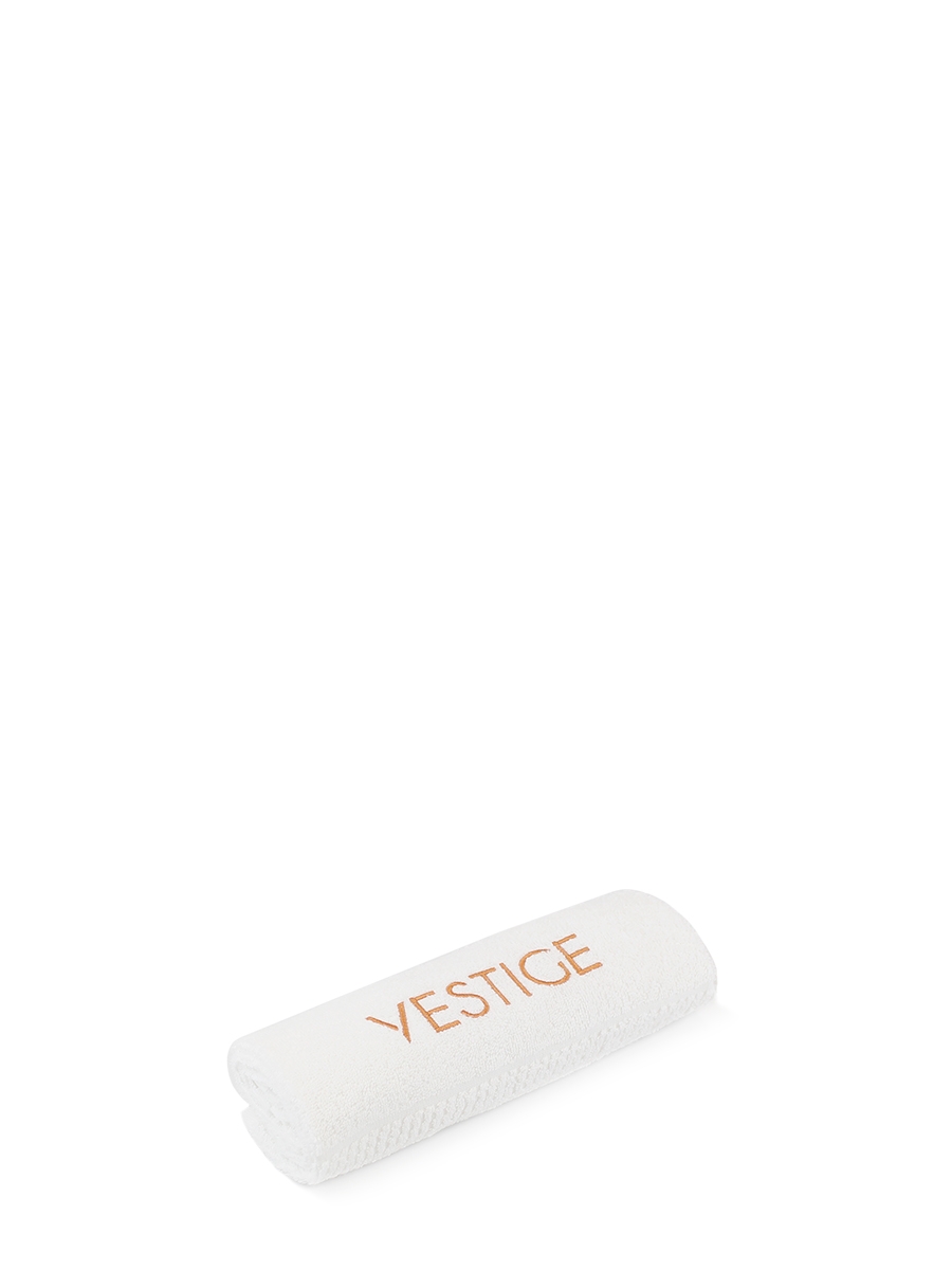White terry towel with Vestige logo, size 40 x 60 cm.