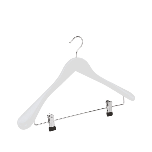 Beechwood Hanger, color white, wide sholders, with clip bar with two adjustable clips and chromed hook, 44 x 5 cm, 50 pieces per box