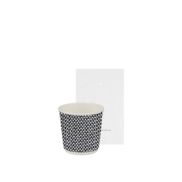 Bicchiere monouso in cartoncino effetto 3D biodegradabile, imbustato in sacchetto di plastica biodegradabile e compostabile, fantasia nera, cartoncino artigianale a doppia parete, prodotto libero da plastica, riciclabile nella carta, adatto a bevande calde e fredde, capacità 115 ml, confezione da 700 pz
