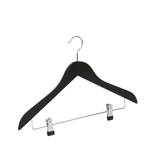 Gruccia in legno di faggio con asta metallica e pinze scorrevoli, gancio nichelato, color nero, 44 x 1,3 cm, confezione da 50 pz