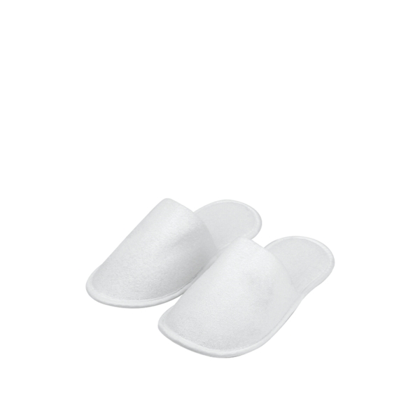 Pantofola Smooth in spugna, colore bianco, misura unisex: 29,5 cm, chiusa, bordatura Economy, sottosuola zigrinata, confezionata in sacchetto di plastica trasparente 100% riciclabile, confezione da 90 pz