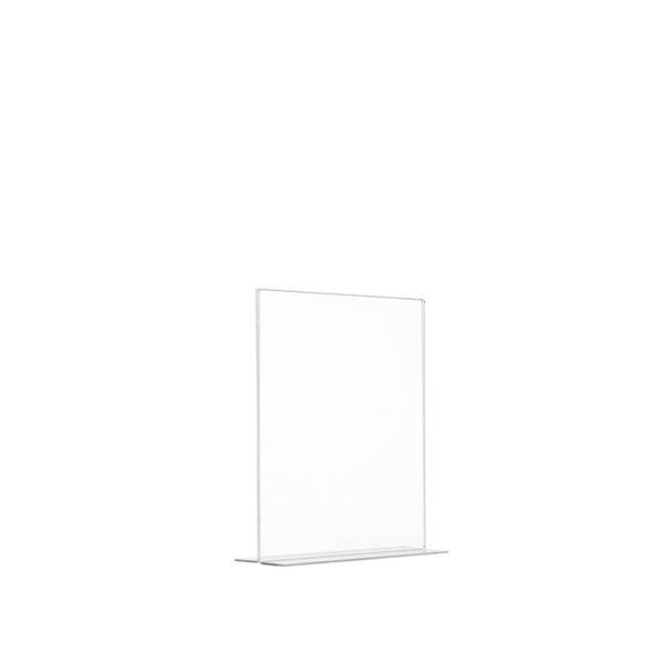 Porta avvisi in plexiglass trasparente con base a T, per formato A3 verticale, plastica 100% riciclabile