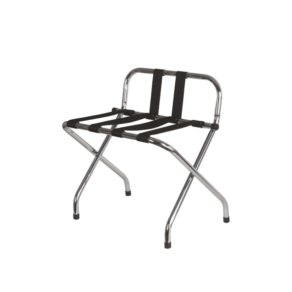 Reggivaligia richiudibile con sponda in metallo cromato e cinghie in PVC nero, 63,5 x 41,5 x h 47/66 cm